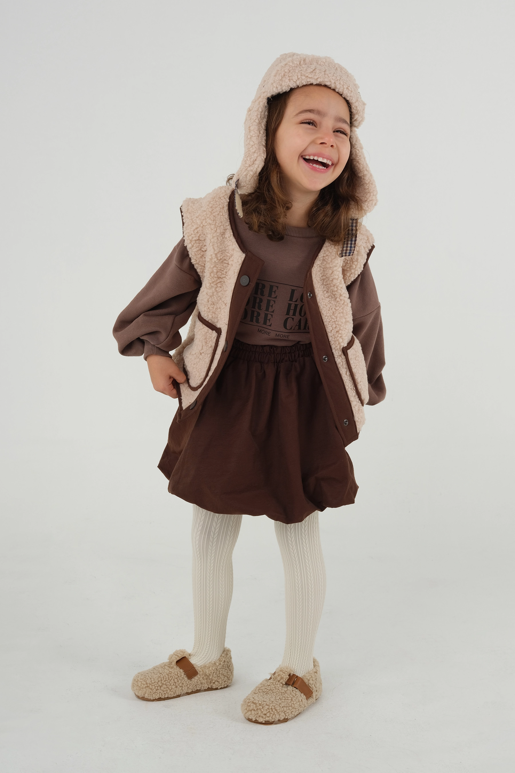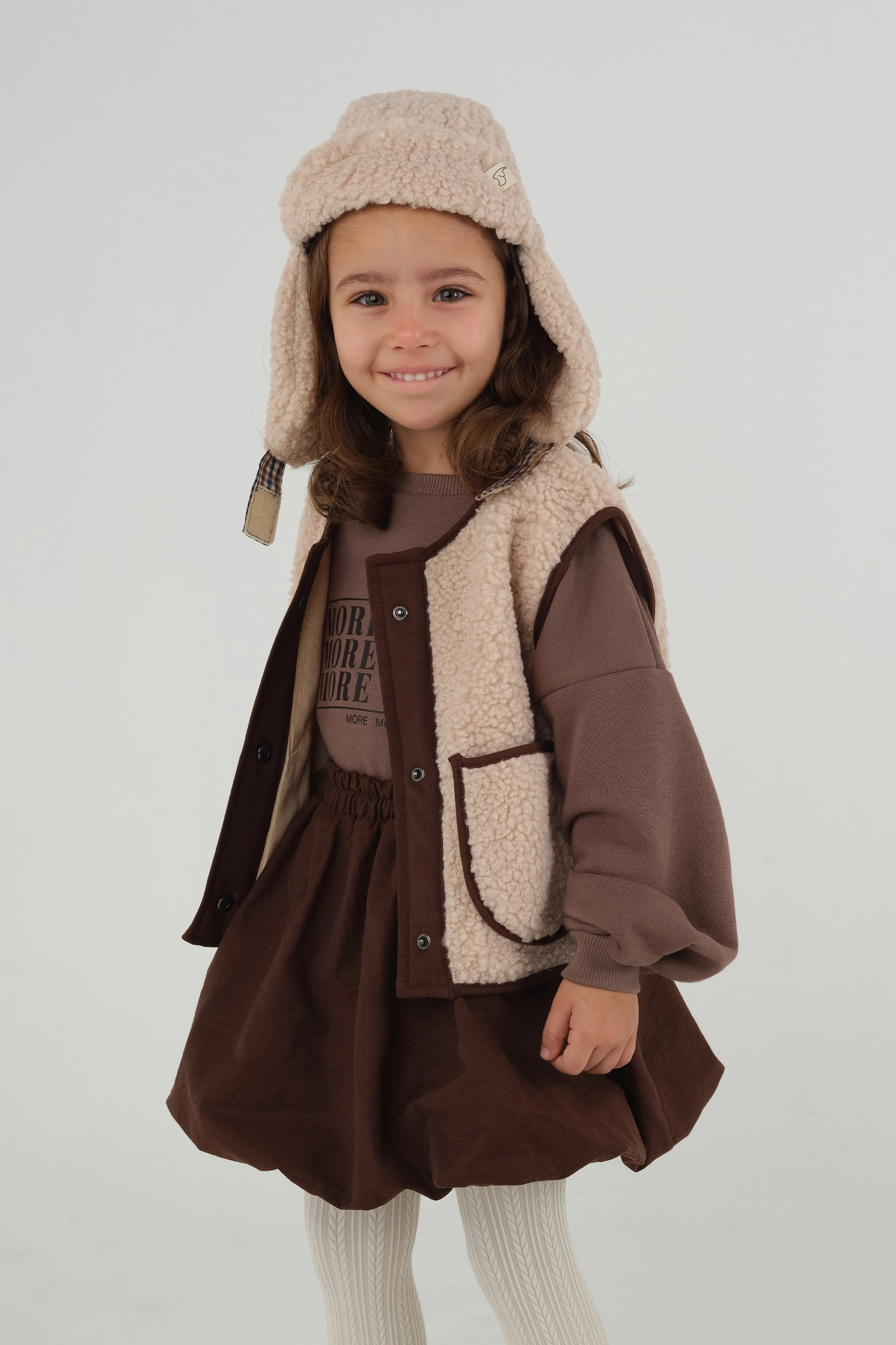 Balon etek, beli lastikli, pamuk vual astarlı. Mankendeki gibi bir duruş için tam yaş aralığını tercih edebilirsiniz.