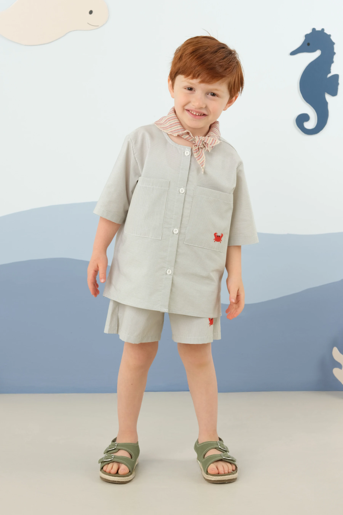 Pamuklu kumaştan üretilmiş, çizgili şortlu takım. Gömlek, bisiklet yakalı, önü düğmeli, arkası pile detaylı, önde iki adet torba cepli, cebi nakış detaylı, kısa kollu. Şort, beli lastikli, yanları yırtmaçlı, nakış detaylı. Ürün bol kalıptır. Mankendeki gibi bir duruş için tam yaş aralığını tercih edebilirsiniz. 30 derecede narin yıkama ayarında yıkama yapmanızı tavsiye ederiz. Kurutma yapılmaz.