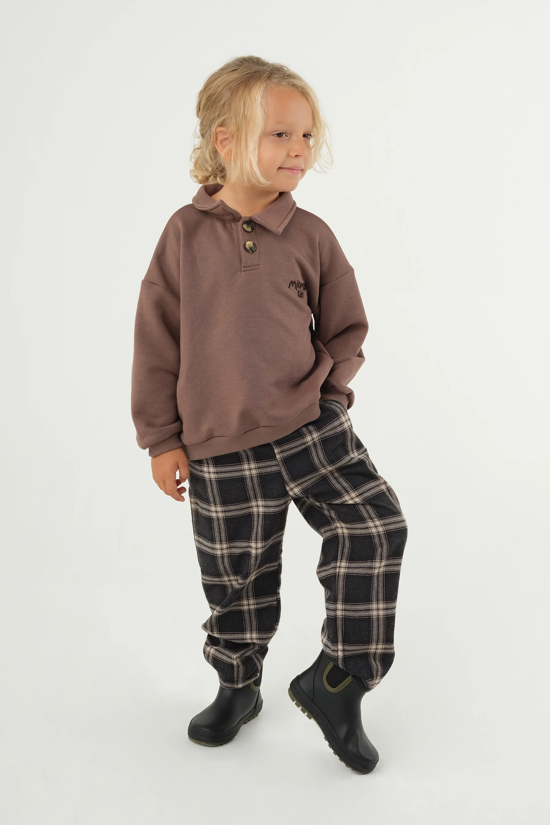 Pamuk 3 iplik kumaştan üretilmiş, yakalı, kol ve etek ucu ribanalı,düşük kollu, önde nakış detaylı, sweatshirt.